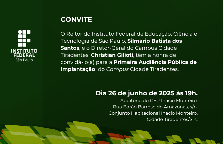 A primeira audiência pública de implantação do Campus Cidade Tiradentes do Instituto Federal de São Paulo (IFSP) acontece no dia 26 de junho de 2025, às 19h, no Auditório do CEU Inácio Monteiro, localizado na rua Barão Barroso do Amazonas, s/n.